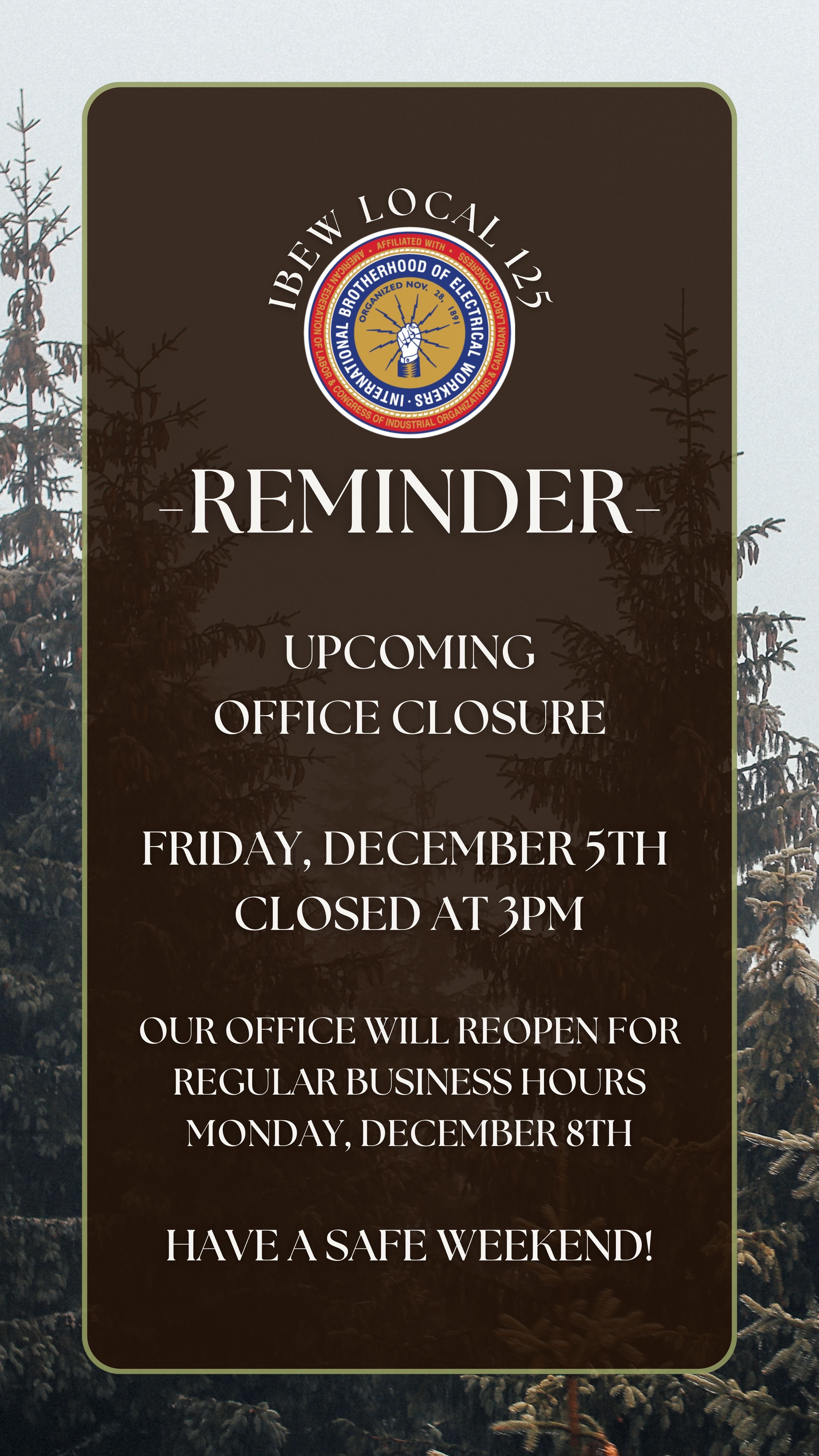 The Union Hall will close at 3:00 PM on Friday, December 5, 2025.